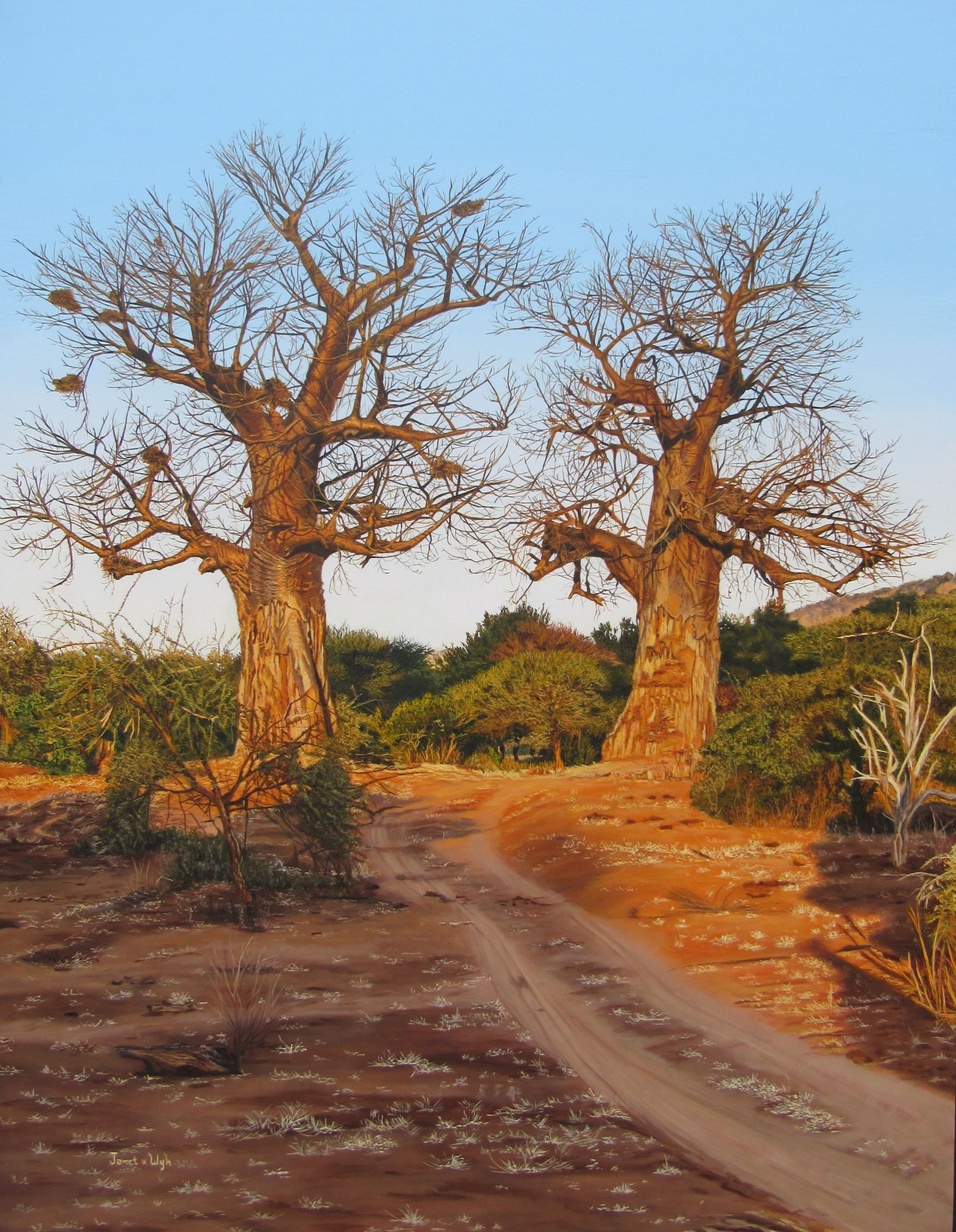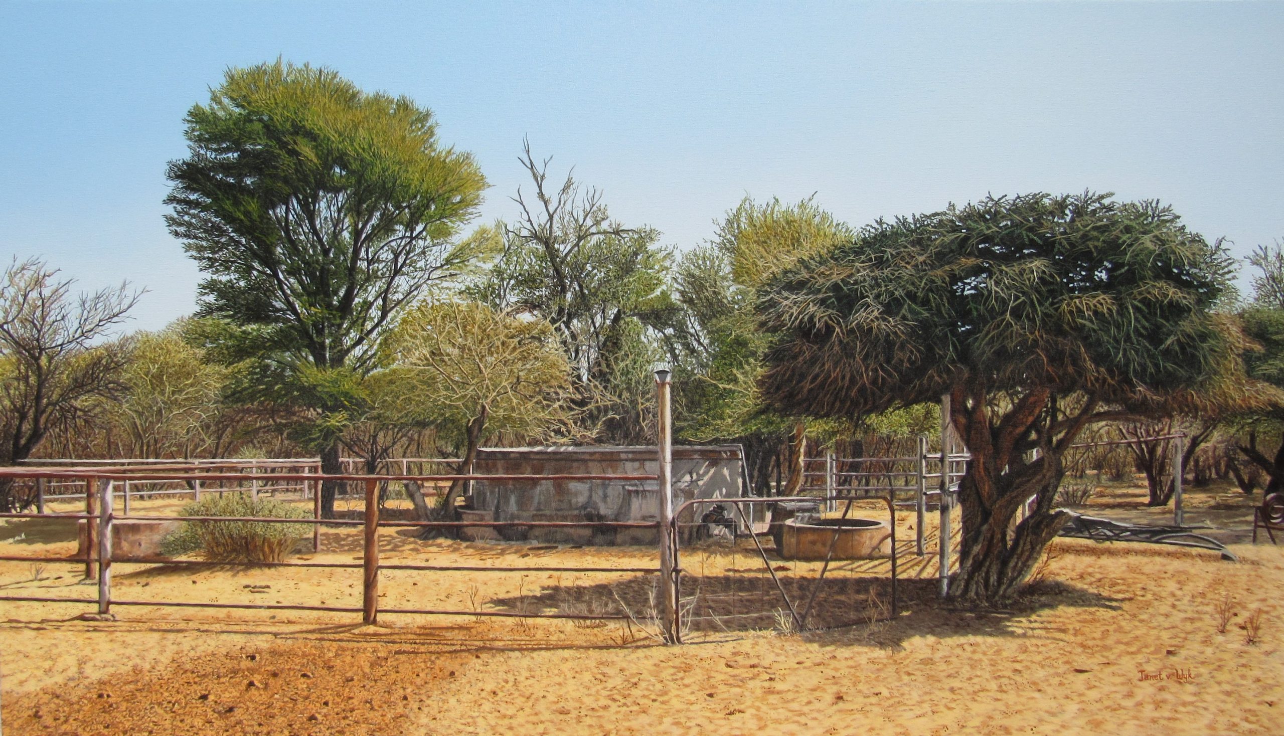 100 x 75 cm, Acrylic on stretched box canvas Dit is altyd ‘n voorreg om die geleendheid te kry om vir mense ‘n stukkie van hul “liefling plek” te kan skilder. Hierdie sementdam kraaltjie is ‘n besonderse deel van die Msigi Wildsplaas in die Thabazimbi distrik. Die interessante stam van die Stink Witgat (Mopipi) boom…